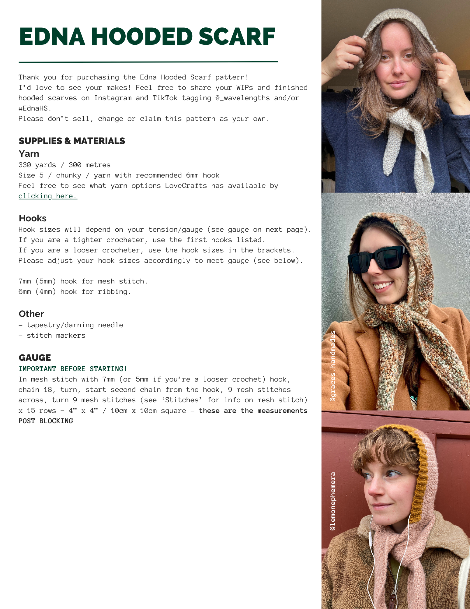 This is a pattern PDF (which you will receive by email!) for the Edna Hooded Scarf with the info and step by step to make one yourself! There are 2 scarf length options in the pattern.