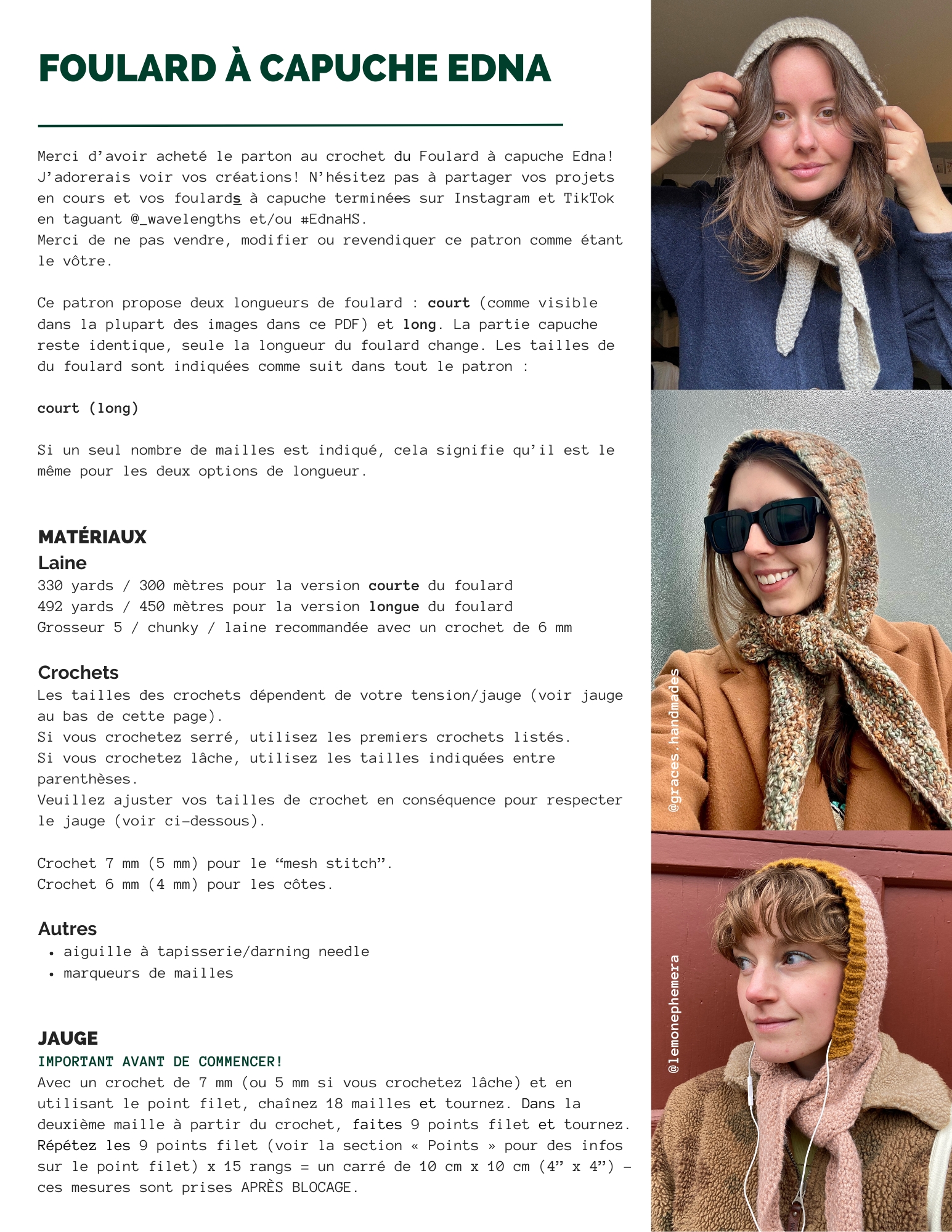Ceci est le patron écrit en français au format PDF (que vous recevrez par e-mail !) pour le Foulard à capuche Edna, avec toutes les informations et les instructions étape par étape pour en réaliser une vous-même! Le patron propose deux options de longueur de foulard.