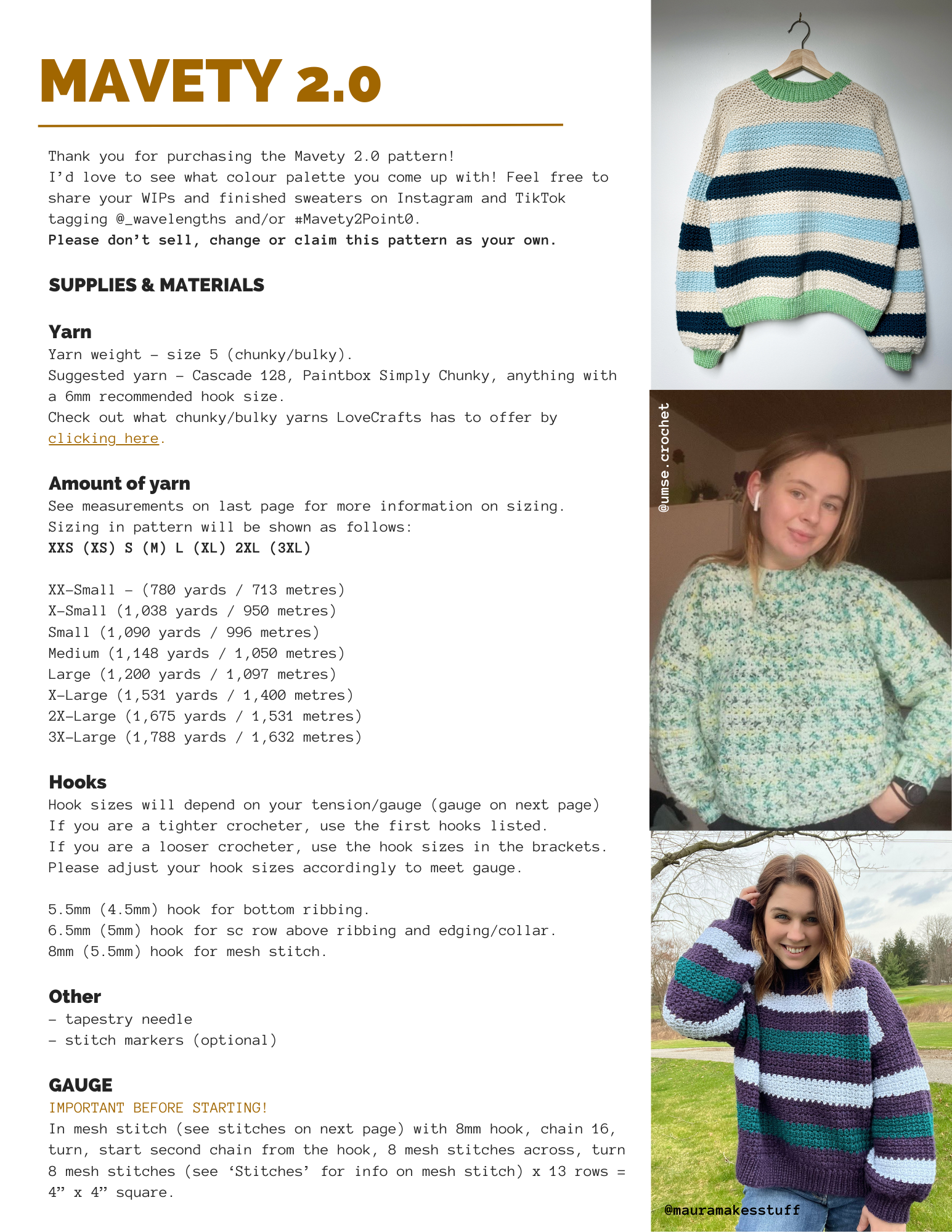 This is a pattern PDF (which you will receive by email!) for the new and improved Mavety Sweater – the Mavety 2.0! With the info and step by step to make one yourself! The pattern is written with instructions for sizes XXS to 3XL.