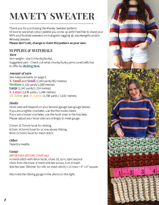 This is a pattern PDF (which you will receive by email!) for the Mavety Sweater with the info and step by step to make one yourself! The pattern is written with instructions for sizes XS to 3XL.