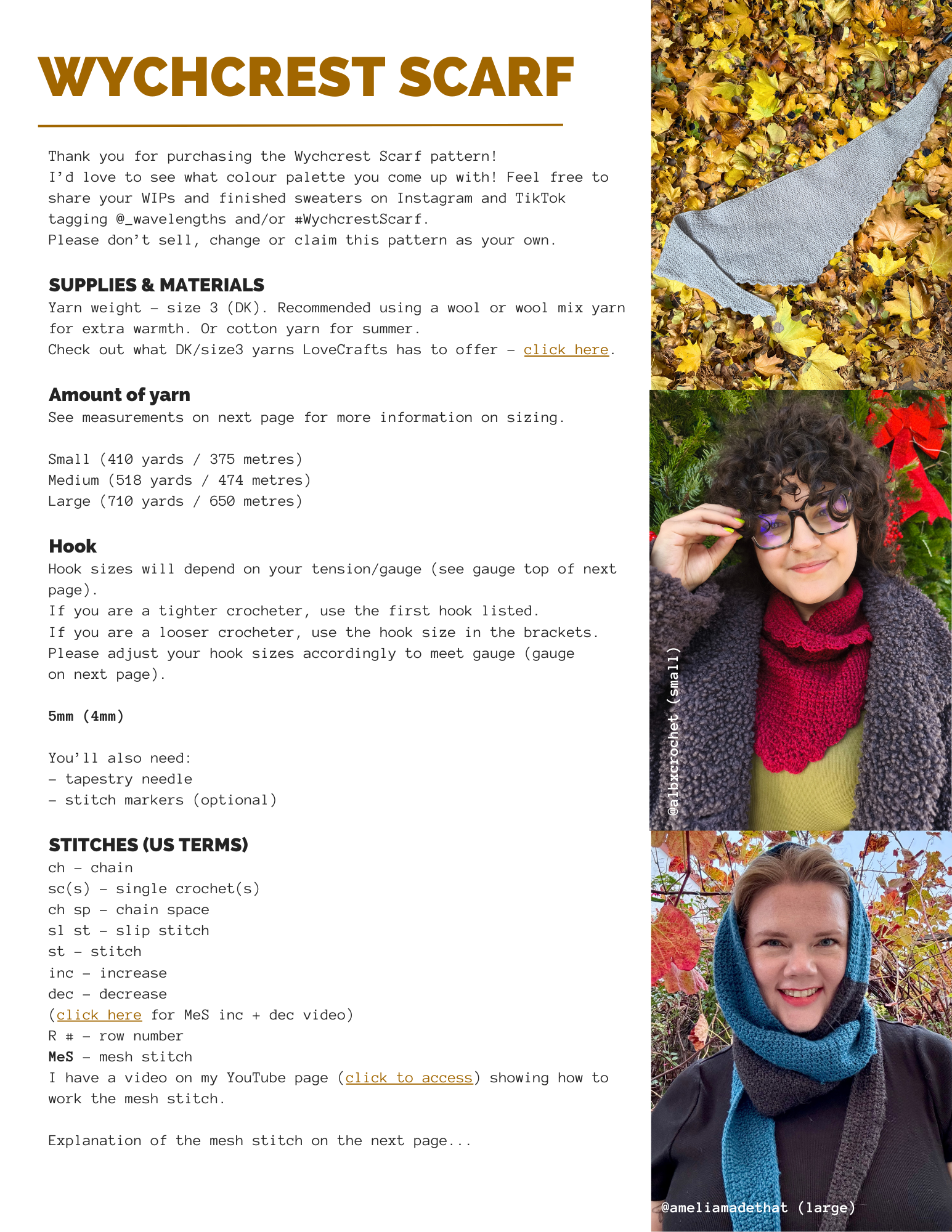 This is a pattern PDF (which you will receive by email!) for the Wychcrest Scarf with the info and step by step to make one yourself!